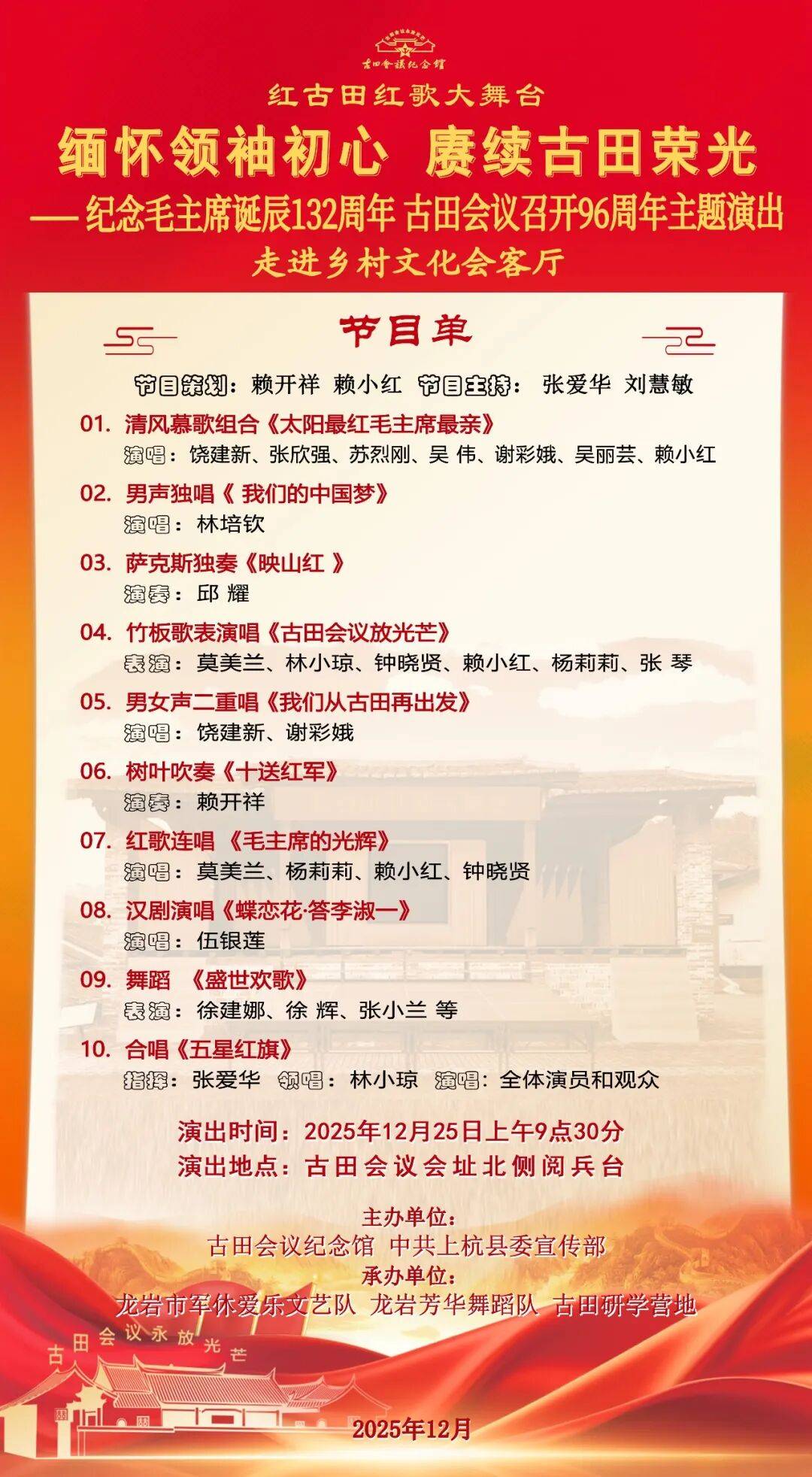 恰逢毛主席诞辰132周年、古田会议召开96周年,为了传承“思想建党、政治建军”的红色基因,缅怀领袖伟绩,古田会议纪念馆联合中共上杭县委宣传部,重磅推出“红古田红歌大舞台”主题演出。这场融红色传承与互动体验于一体的文化盛宴,将于2025年12月25日上午9:30,在古田会议会址北侧阅兵台温情启幕。