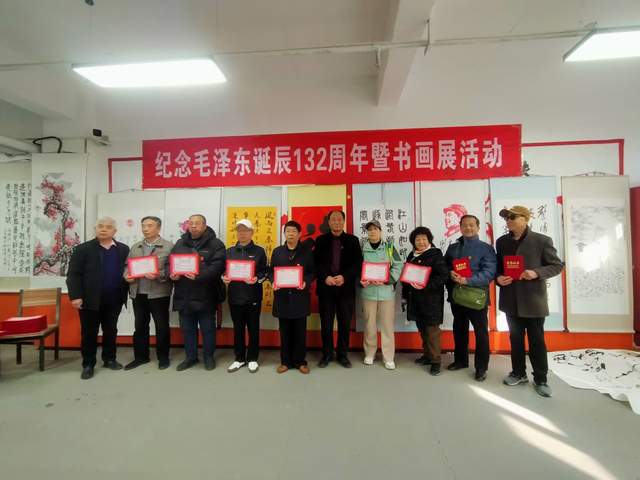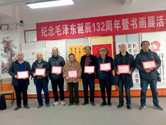 活动现场,李英歧会长向参加纪念毛主席诞辰132周年书画展的获奖作者颁发了荣誉证书,并合影留念。笔会开始后,数十位与会人员,围绕纪念毛主席诞辰132周年这一主题进行专题创作,自由交流创作心得,切磋技艺,活动圆满成功。