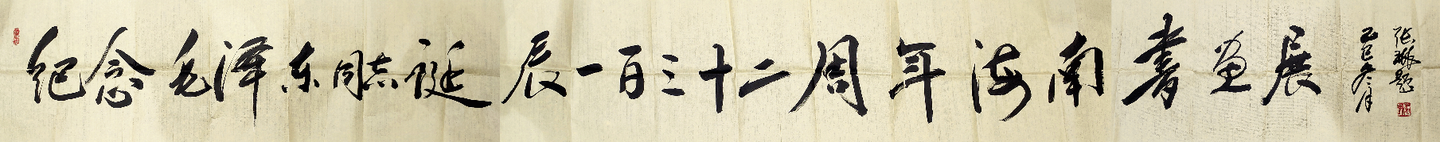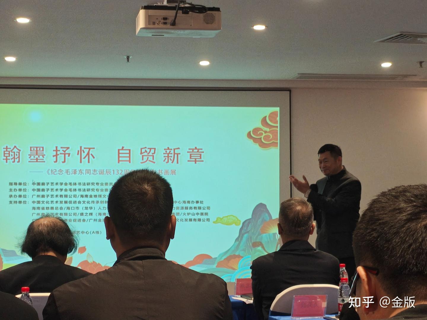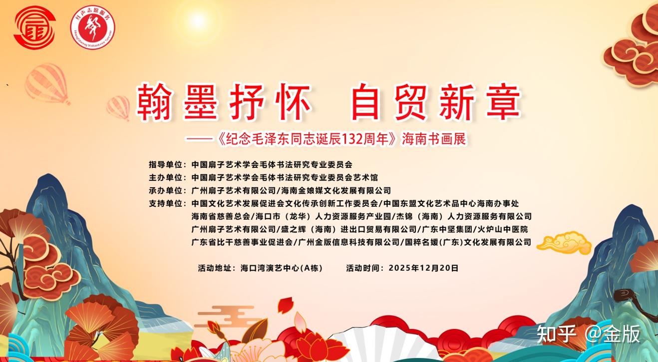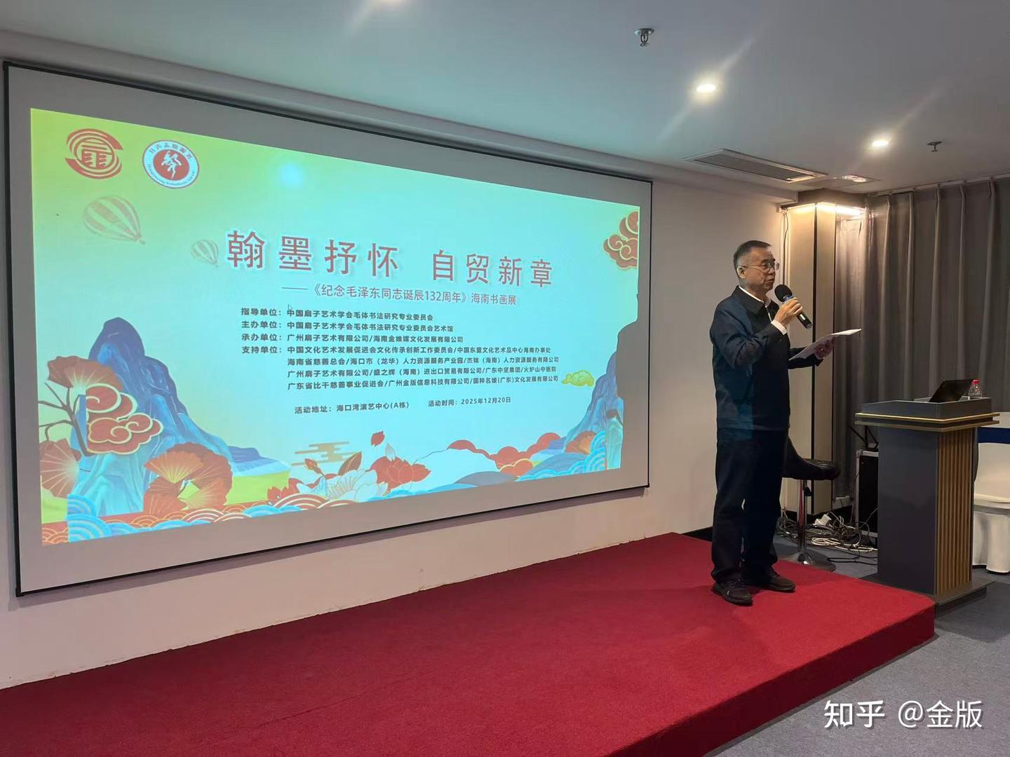12月20日上午,椰风海韵中的海口湾演艺中心翰墨飘香,群贤毕至。由中国扇子艺术学会毛体书法研究专业委员会指导,中国扇子艺术学会毛体书法研究专业委员会艺术馆主办,广州扇子艺术有限公司、海南金娘媒文化发展有限公司承办,中国文化艺术发展促进会文化传承创新工作委员会、中国东盟文化艺术品中心海南办事处、海南省慈善总会、海口市(龙华)人力资源服务产业园、杰锦(海南)人力资源服务有限公司、广东中坚集团、盛之辉(海南)进出口贸易有限公司、广东省比干慈善事业促进会、红声志愿服务队、广州金版信息科技有限公司、国粹名媛(广东)文化发展有限公司、火炉山中医院等共同支持举办的“翰墨抒怀·自贸新章——《纪念毛泽东同志诞辰132周年》海南书画展”在这里隆重开幕。本次活动旨在以书画艺术深切缅怀伟人丰功伟绩,传承红色基因,同时礼赞海南自贸港建设里程碑成就,展现新时代开放发展的蓬勃气象。