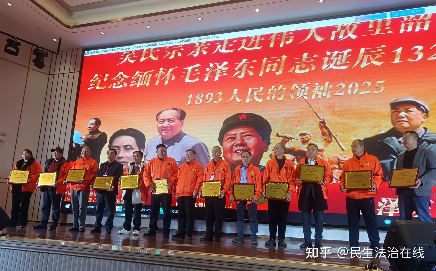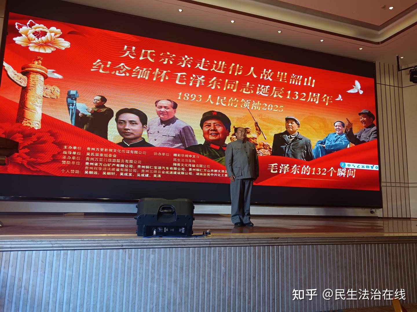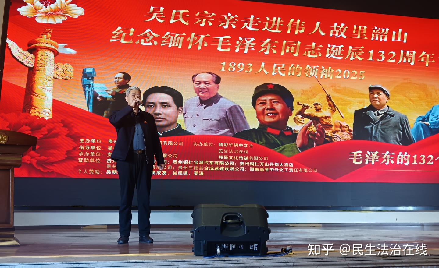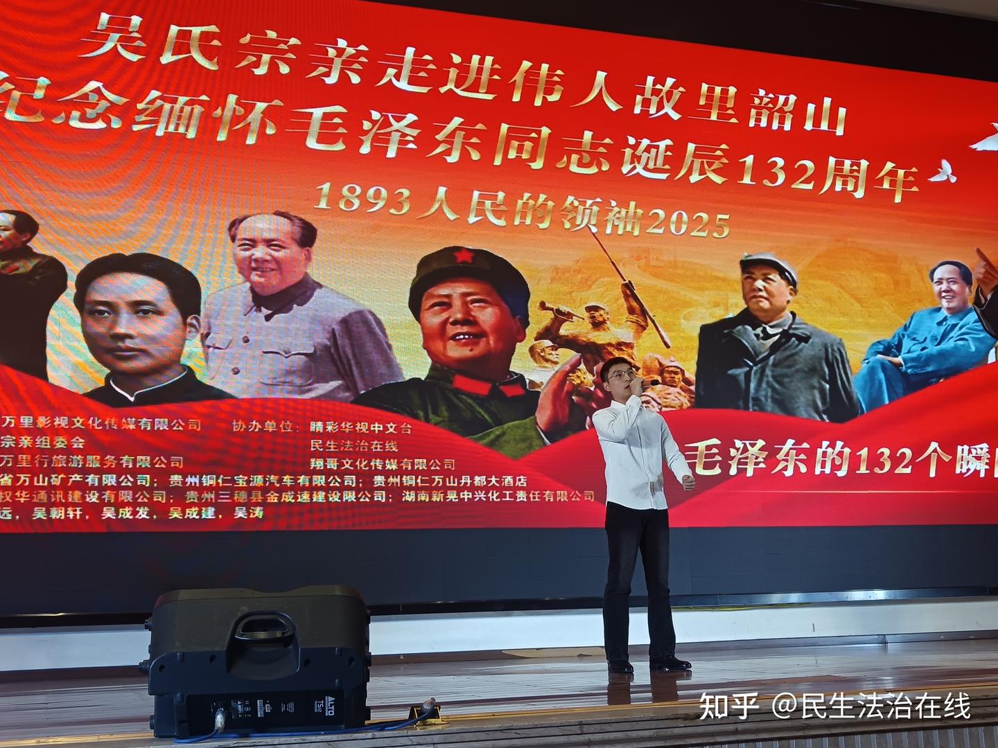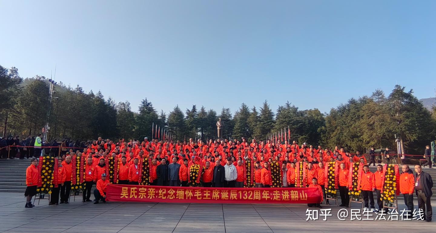 现场气氛热烈而庄重,彩旗飘扬,横幅高悬,“吴氏宗亲走进韶山纪念、缅怀人民领袖毛泽东诞辰132周年活动”的标语格外醒目。